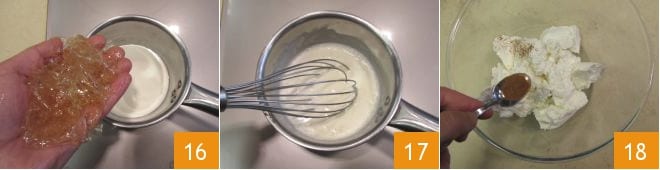 En este punto calentad 40 g de nata en un cazo, retirad del fuego y añadid la gelatina bien escurrida 16. Mezclad con un batidor para disolverla completamente 17 y dejad que se temple. Poned la ricotta en un bol grande y añadid la canela 18.