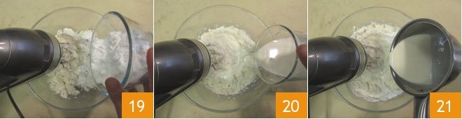 Trabajad la ricotta con las varillas eléctricas añadiendo el azúcar glas 19 y los restantes 100 g de nata líquida 20, luego verted también la nata en la que habéis disuelto la gelatina 21.