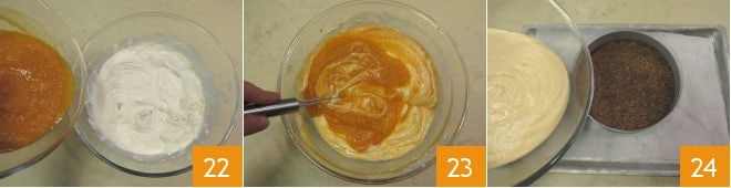 Finalmente, añadid el puré de calabaza 22 y mezclad con una espátula hasta obtener una mezcla homogénea 23. Tomad la base del frigorífico y verted la crema de calabaza dentro del molde 24.