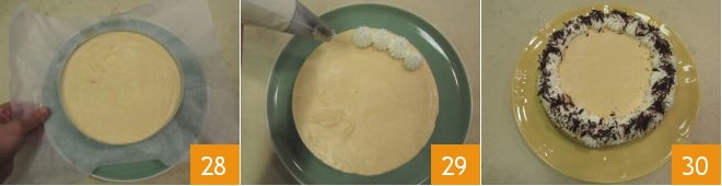 Nivelad la superficie 25 y dejad que se solidifique en el frigorífico durante al menos 4-6 horas. Transcurrido el tiempo de enfriamiento, podéis dedicaros a la decoración: montad la nata con el azúcar glas 26 y transferid la nata montada a una manga pastelera 27.