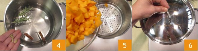 Llenad una vaporera con agua, añadid las ramas de canela, las ramitas de romero y las semillas de cardamomo 4 y llevad a ebullición. Verted la calabaza en el cestillo 5, cubrid con la tapa 6 y coced al vapor durante unos 20 minutos o hasta que esté bien cocida.