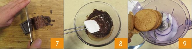 Mientras tanto, preparad la base: picad el chocolate negro con un cuchillo 7 y derretidlo en el microondas o al baño maría 8, luego poned las galletas en un procesador de alimentos 9 y triturad para reducirlas a polvo.