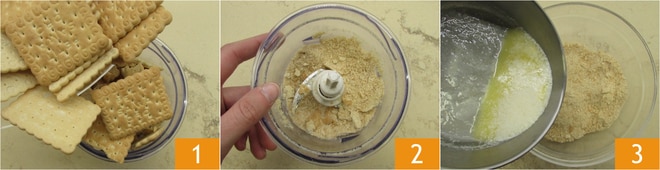 Para realizar la cheesecake horneada con fresas y mascarpone, lo primero que debéis hacer es preparar la base: colocad las galletas secas en un procesador de alimentos 1 y trituradlas finamente 2. Mientras tanto, derretid la mantequilla en un cazo. Transferid las galletas trituradas a un bol y añadid la mantequilla derretida y templada 3.