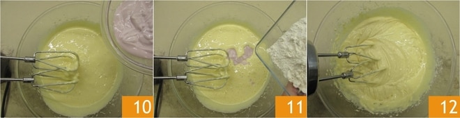 Luego, unid el yogur de fresas 10 y mezclad nuevamente. Finalmente, verted la harina tamizada 11 e incorporadla con la batidora de manera homogénea 12.