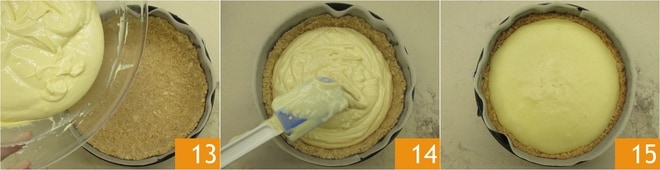 Recuperad el molde y verted la crema obtenida sobre la base de galletas 13, luego nivelad la superficie con una espátula 14. Hornead en el horno estático precalentado a 165° durante unos 50 minutos. Una vez cocida, retirad del horno y dejad enfriar completamente a temperatura ambiente 15.