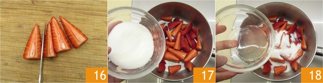 Mientras tanto, dedicad tiempo a la salsa: lavad las fresas, eliminad el tallo y cortadlas en 4 partes 16. Verted las fresas en un cazo junto con el azúcar 17 y el zumo de limón 18.