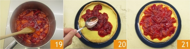 Cocinad a fuego medio-alto durante unos 7-10 minutos: debéis obtener la consistencia de una mermelada densa con los trozos aún visibles 19. Dejad templar la salsa de fresas y luego transferidla al frigorífico para que se enfríe. Cuando la cheesecake también esté fría, decorad la superficie con la salsa distribuyéndola con el dorso de una cuchara 20. ¡Vuestra cheesecake horneada con fresas y mascarpone está lista para ser servida 21!