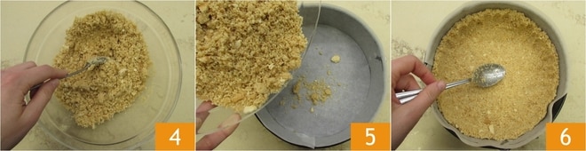 Mezclad bien para amalgamar la mezcla 4. Forrad un molde desmontable de 20 cm de diámetro con papel pergamino y verted dentro la mezcla de galletas 5. Compactad la base con el dorso de una cuchara y cread un borde irregular de unos 4 cm de altura 6. Colocad la base en el frigorífico y dejad enfriar durante aproximadamente una hora (o 30 minutos en el congelador).