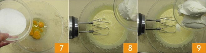 Mientras tanto, podéis ocuparos del relleno: verted en un bol grande los huevos y el azúcar 7 y batid con una batidora eléctrica hasta obtener una mezcla suave y bien montada. Continuando batiendo, añadid el queso crema 8 y el mascarpone 9.