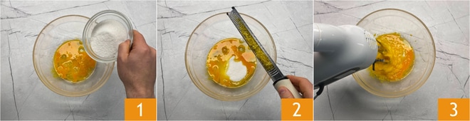 Para preparar la tarta de requesón esponjosa, comienza rompiendo los huevos en un bol, luego añade el azúcar 1 y la ralladura de limón 2. Pon las varillas en marcha durante unos diez minutos 3.