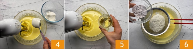 Cuando la mezcla haya duplicado su volumen, añade el requesón a cucharadas 4, luego baja un poco la velocidad e incorpora el aceite poco a poco 5. Apaga las varillas y tamiza la harina y la levadura en el bol 6.