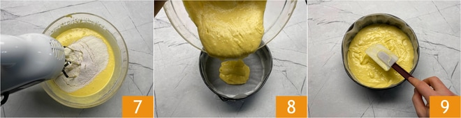 Pon las varillas en marcha nuevamente a velocidad muy baja solo el tiempo necesario para incorporar todo 7. Vierte la mezcla en un molde de 21-22 cm engrasado y forrado con papel de horno 8, luego nivela bien la superficie 9.
