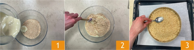 Para preparar la tarta de requesón y arándanos, comenzad derritiendo el chocolate blanco sin superar los 40°. Desmenuzad las galletas y luego mezclad todo 1 2. Forrad con acetato un aro de 22 cm de diámetro, adherid bien la base de galletas y chocolate, de unos 4 cm de altura 3 y poned a solidificar en la nevera durante unos 30 minutos.