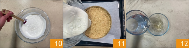Incorporad los 100 g de nata semimontada y mezclad de nuevo 10. Verted sobre la base 11 y dejad solidificar 3 horas en la nevera. Para la gelatina de arándanos: remojad las hojas de gelatina en agua fría 12.