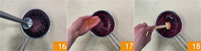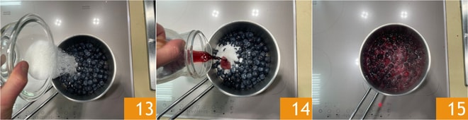 En un cazo verted los arándanos, el azúcar 13 y el vino tinto 14. Coced durante unos 5-10 minutos, luego apagad el fuego 15.