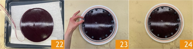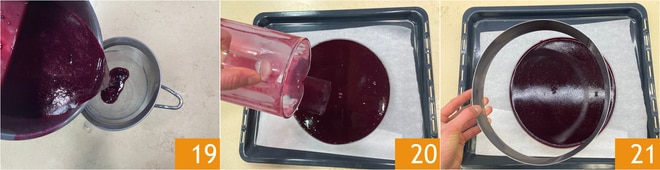 Pasad la gelatina por un colador 19 para hacerla más fluida y luego vertedla sobre la tarta 20. Guardad el dulce en la nevera durante 2 horas para solidificar. Luego retirad el aro 21.