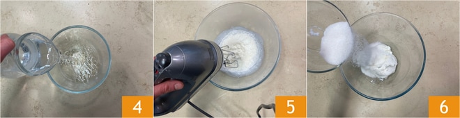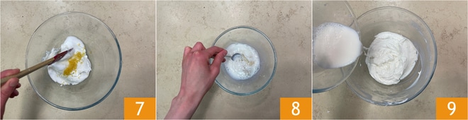 Aromatizad con la ralladura de limón 7, mezclad todo 8. Disolved la gelatina bien escurrida en la leche caliente, una vez disuelta bien la gelatina verted la leche en el compuesto de requesón 9 y mezclad bien con una varilla.