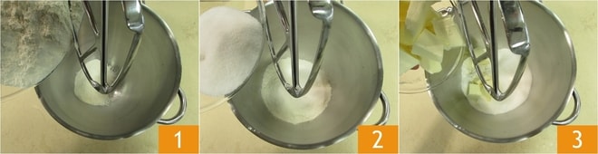 Para preparar la tarta con ricotta y Nutella, empezad con la masa. En el bol de la batidora echad la harina 00 1, el azúcar 2 y la mantequilla fría de la nevera en trozos 3.