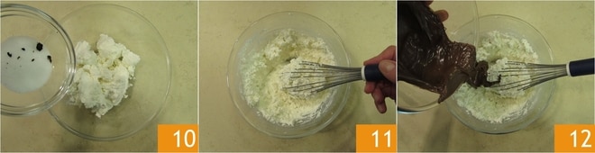 Verted la ricotta en otro cuenco, añadid el azúcar 10 y trabajad bien con una batidora de mano 11. Cuando el azúcar haya sido absorbido, añadid la Nutella 12.