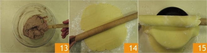 Mezclad bien con una espátula, hasta obtener una crema homogénea. Cubrid con film y guardad en el frigorífico hasta su uso. En cuanto la masa haya reposado, transferidla al plano de trabajo enharinado y estiradla hasta obtener un grosor de medio cm 14. Enrolladla en el rodillo y transferidla con cuidado dentro de un molde de 22 cm de diámetro 15.