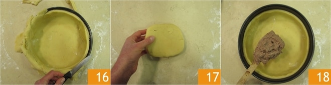 Haced una ligera presión con las manos, para que la masa se adhiera bien al molde. Con un cuchillo, eliminad el exceso de masa en los bordes 16. Trabajad rápidamente todos los restos de masa 17, servirán para hacer las rejillas. Sacad la crema de ricotta y Nutella del frigorífico y utilizadla para rellenar la base de masa 18.