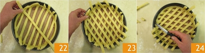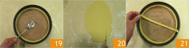 Alisad bien la superficie con una cuchara 19. Estirad entonces la masa restante, hasta obtener siempre un grosor de medio cm. Realizad tiras de aproximadamente 1,5 cm de ancho 20. Colocad las tiras sobre la tarta, primero en un sentido 21