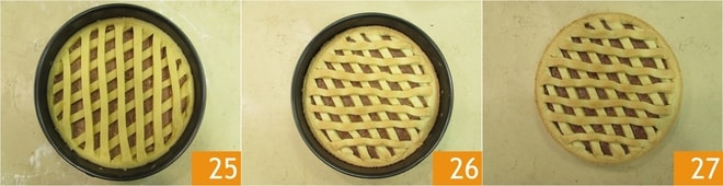 Una vez formada la rejilla 23, podéis hornear la tarta en horno estático precalentado a 180° durante 40 min. Transcurrido este tiempo, sacadla del horno 26 y dejad que se enfríe antes de desmoldarla y servirla 27.