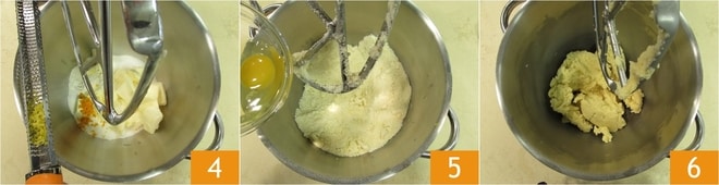 Añadid también la ralladura de naranja y la de limón, ambas ralladas 4. Trabajad con la pala durante unos 2 minutos hasta obtener una masa arenosa. En este punto añadid tanto el huevo 4 como la yema. Trabajad aún durante un par de minutos, hasta obtener una masa compacta y homogénea 6. Intentad no trabajar la masa mucho tiempo, evitad calentarla excesivamente, para no crear la red de gluten que haría la masa compacta y no quebradiza.