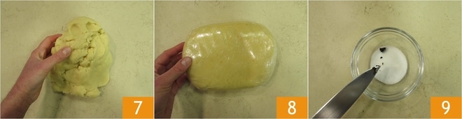 Transferid la masa al plano de trabajo 7 y formad un bloque. Envolved con film 8 y dejad reposar en el frigorífico durante al menos 1 hora. Mientras tanto, preparad la crema de ricotta y Nutella. Verted el azúcar en un cuenco pequeño 9 y añadid las semillas de la vaina de vainilla 9.