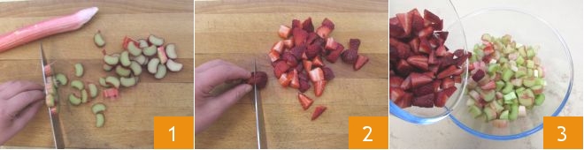 Para preparar la tarta de ruibarbo comienza ocupándote del relleno: limpia el ruibarbo, quitándole las hojas y los filamentos como si fuera un apio. Corta el tallo del ruibarbo en trozos 1, luego limpia las fresas y córtalas en 4 2. Une fresas y ruibarbo en un bol 3,