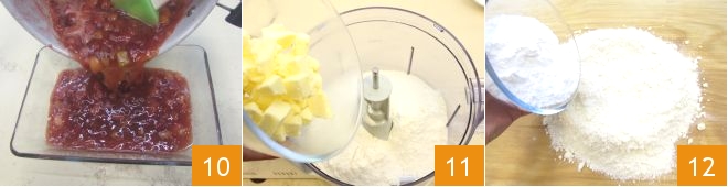 Cuando la mermelada de ruibarbo está lista, transfiérela a un bol para que se enfríe 10. Mientras tanto, ocúpate de la Pasta quebrada: en el procesador de alimentos une la harina y la mantequilla fría de la nevera cortada en trozos 11. Tritura todo para obtener una mezcla de aspecto arenoso, luego viértela sobre la mesa de trabajo, formando la clásica forma de volcán, y agrega el azúcar glas 12.