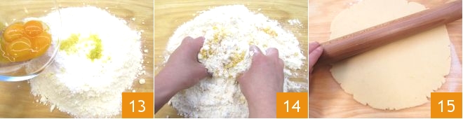 Incorpora también la ralladura de limón y las yemas 13, y amasa brevemente 14, justo lo necesario para hacer la masa compacta. Forma un bloque, envuélvelo con el film y déjalo reposar en la nevera durante 30 minutos. Transcurrido el tiempo necesario, estira la masa con un rodillo hasta aproximadamente 1 cm de espesor 15.