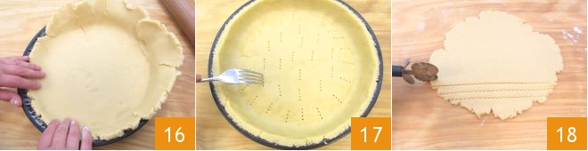 Con el rodillo, extiéndela dentro del molde para tartas de 25 cm de diámetro, engrasado y enharinado, haciéndola adherirse a la base y a los bordes con pequeñas presiones de los dedos 16. Con un cuchillito elimina el exceso de masa, reservándola, y pincha la base de la tarta con los dientes de un tenedor 17. Vuelve a amasar el exceso de masa, y extiéndela de nuevo para obtener, con un cortador de pastas, tiras 18 que usarás para la decoración.