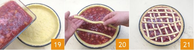 Vierte la mermelada de fresas y ruibarbo dentro de la base de masa quebrada 19 y completa disponiendo las tiras de masa sobre la superficie de la tarta 20, para formar rombos. Cocina en horno estático precalentado a 180° durante 40 minutos (o a 160° durante 30 minutos si es en horno ventilado), luego saca tu tarta de ruibarbo del horno 21 y déjala enfriar antes de desmoldarla!