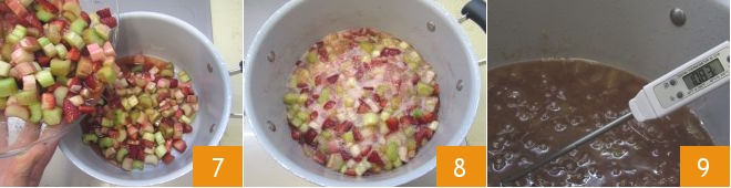 Transcurrido el tiempo necesario, traslada las fresas y el ruibarbo a una olla 7 y cocina durante 10 minutos a fuego medio, luego durante otros 50-60 minutos a fuego bajo. En este punto haz disolver en la mermelada la fécula de patata 8 y deja la mezcla al fuego hasta que alcance los 108° (puedes controlar la temperatura con un termómetro de cocina) 9.
