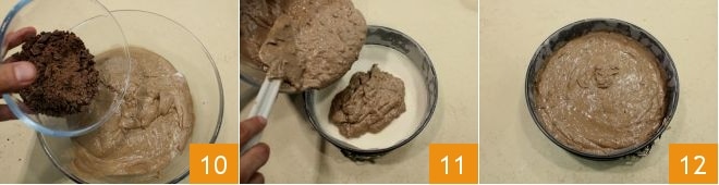 Y añadidlo a la masa que habéis conseguido 10. Engrasad y forrad con papel de horno un molde de 22 cm de diámetro y verted allí la mezcla 11, nivelándola bien con la espátula 12.