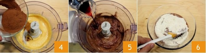 Añadid también el cacao amargo 4 y luego el vino tinto 5. Mezclad hasta obtener una crema de color uniforme y en este punto transferid la masa a un bol; verted la harina tamizada mezclada con la levadura y mezclad bien con una espátula para evitar la formación de grumos 6.
