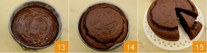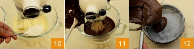 y cuando el aceite se haya absorbido completamente, añade los ingredientes secos una cucharada a la vez 10. Cuando también la harina se haya incorporado completamente, puedes añadir el chocolate derretido ya frío 11 y trabajar la masa unos minutos más para obtener una mezcla homogénea y fluida. Engrasa y forra un molde de 24 cm de diámetro con papel de horno. Vierte dentro la masa 12