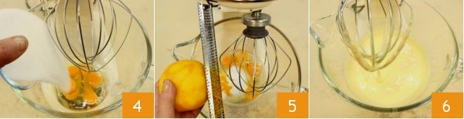 Mientras tanto, en el bol de una batidora equipada con varillas, vierte los huevos y añade el azúcar 4, ralla la cáscara de 1 naranja no tratada 5 y comienza a trabajar la mezcla: deberá resultar blanca y espumosa 6.