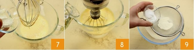 En este punto, añade el yogur poco a poco 7 y cuando se haya incorporado, añade el aceite de semillas en hilo 8. Luego, en un bol tamiza la harina con la levadura 9