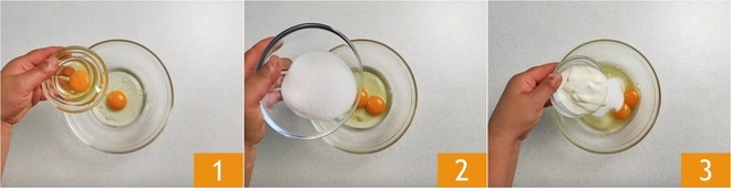 Para preparar la tarta de yogur con chispas de chocolate, coloca en un bol los huevos 1 con el azúcar 2 y el yogur 3.