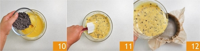 Añade también las chispas 10 y mezcla una última vez con la espátula 11; solo el tiempo necesario para obtener una masa homogénea. Luego viértela en un molde de 22 cm forrado con papel de horno 12.