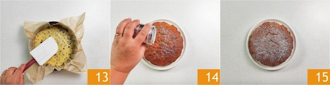 Nivela bien la superficie 13 y hornea en horno estático precalentado a 180°C durante 45 minutos. Antes de sacar la tarta del horno, haz siempre la prueba del palillo. Deja enfriar la tarta con la puerta del horno ligeramente abierta. Después, desmóldala, retírala del molde y espolvorea con azúcar glas 14 antes de servirla 15.