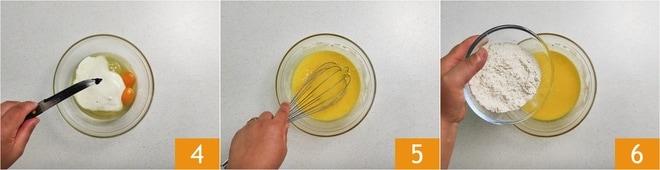 Añade las semillas que hayas extraído de una vaina de vainilla 4 y bate con un batidor de mano 5. Tan pronto como todos los ingredientes estén bien mezclados, añade también la harina tamizada 6.