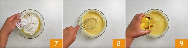 Por último, tamiza también la levadura y agrégala a la masa 7; mezcla bien con un batidor hasta obtener una mezcla lisa y sin grumos; luego añade el aceite 9 y mezcla bien para que se absorba.