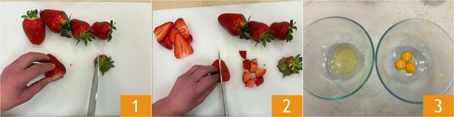 Para preparar la tarta de yogur con fresas y almendras, como primer paso, lavad delicadamente las fresas y eliminad el tallo 1. Cortad la mitad en rodajas (las más bonitas) y la otra mitad en cubitos 2. Luego separad las claras y las yemas de los huevos en 2 cuencos 3.