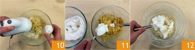 Incorporad también la levadura para dulces tamizada 10 y mezclad bien con las varillas. Obtendréis una mezcla compacta. Incorporad entonces las claras poco a poco 11 mezclando delicadamente de abajo hacia arriba 12.