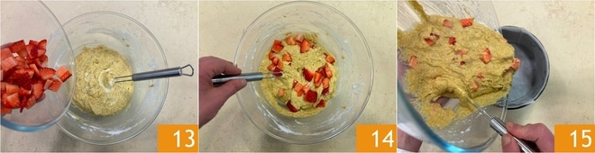 Añadid luego las fresas en cubitos 13 y mezclad, siempre delicadamente 14. Verted la mezcla en un molde desmontable de 17 cm de diámetro y 9 cm de alto, forrado con papel de horno 15.