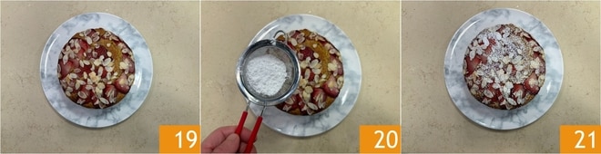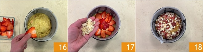 Decorad la superficie con las fresas cortadas en rodajas 16 y las láminas de almendras 17. Coced en horno estático precalentado a 180° durante 30-35 minutos; una vez cocida, sacad del horno y dejad enfriar 18.