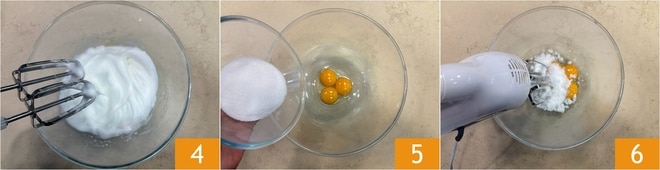 Montad las claras a punto de nieve 4 y reservadlas, luego verted el azúcar en las yemas 5 y trabajad con las varillas eléctricas 6.